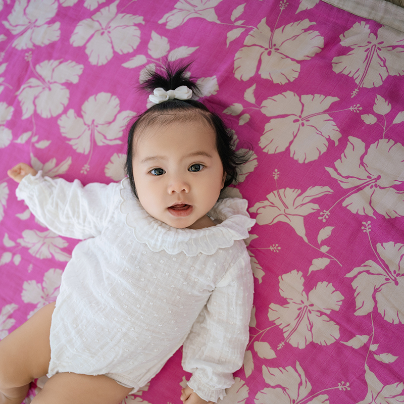 肌寒い夜、アロハテイストのシルクのように肌触りがよくやわらかいベビーブランケットでちょっとラグジュアリーな時間をお過ごしください。